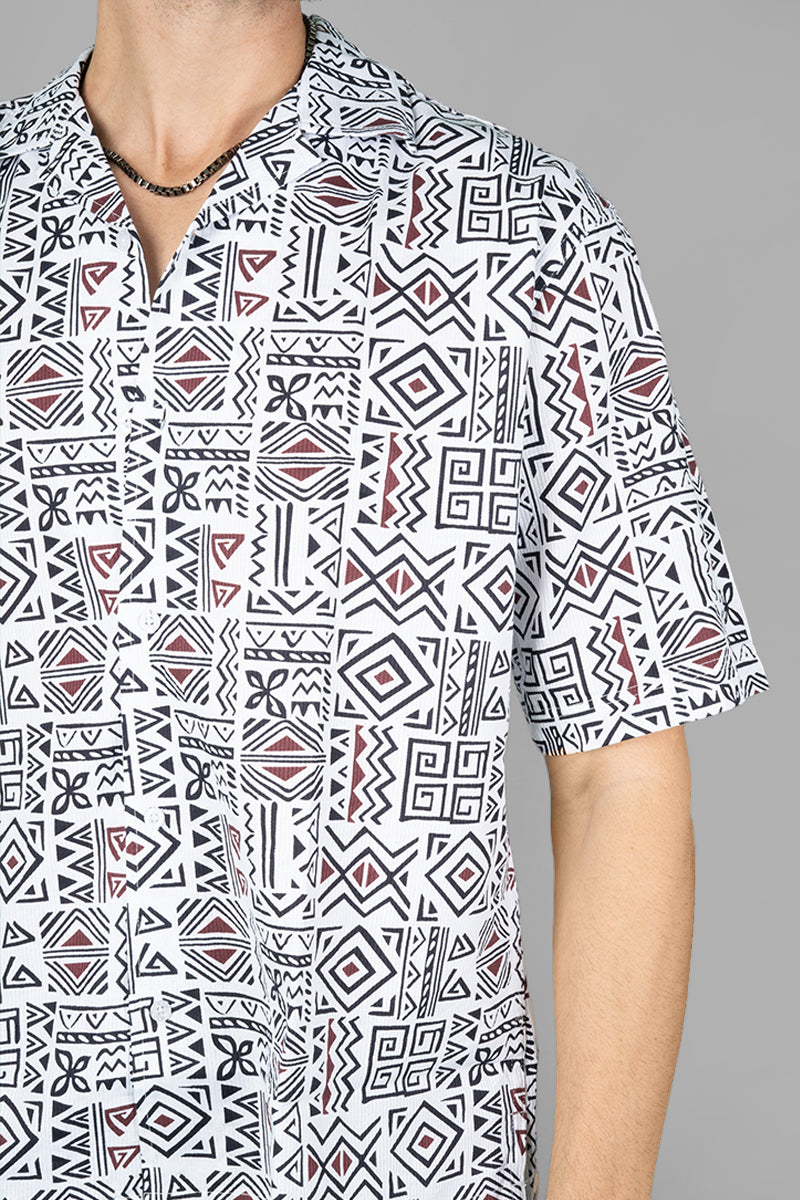 Elevate your casual style with our Trending Men's White Patterned Tribal Patterned Shirt featuring a striking Tribal Print on a classic Cuban Collar design. Crafted from 100% Cotton, it offers comfort with a half-sleeve style, perfect for a laid-back look. Easy-care with cold machine wash